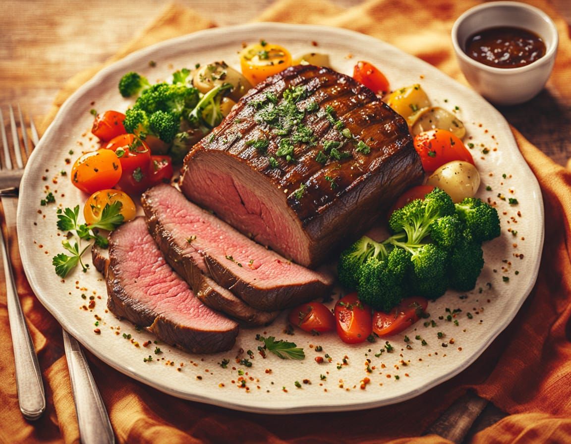 This image shows a still life of roast beef and vegetables on a plate, presented as a culinary art masterpiece. It uses a warm color palette and soft focus, reminiscent of impressionist painting.