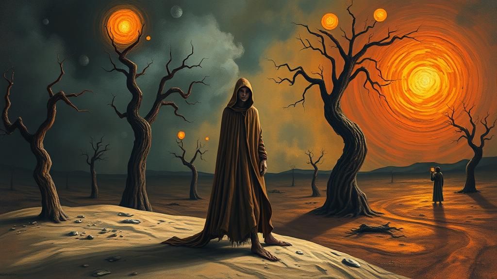 A surreal image of a cloaked seer in a desolate landscape, embodying finality. The artwork evokes biomorphic forms and distorted environments in a surreal style with vibrant colors.