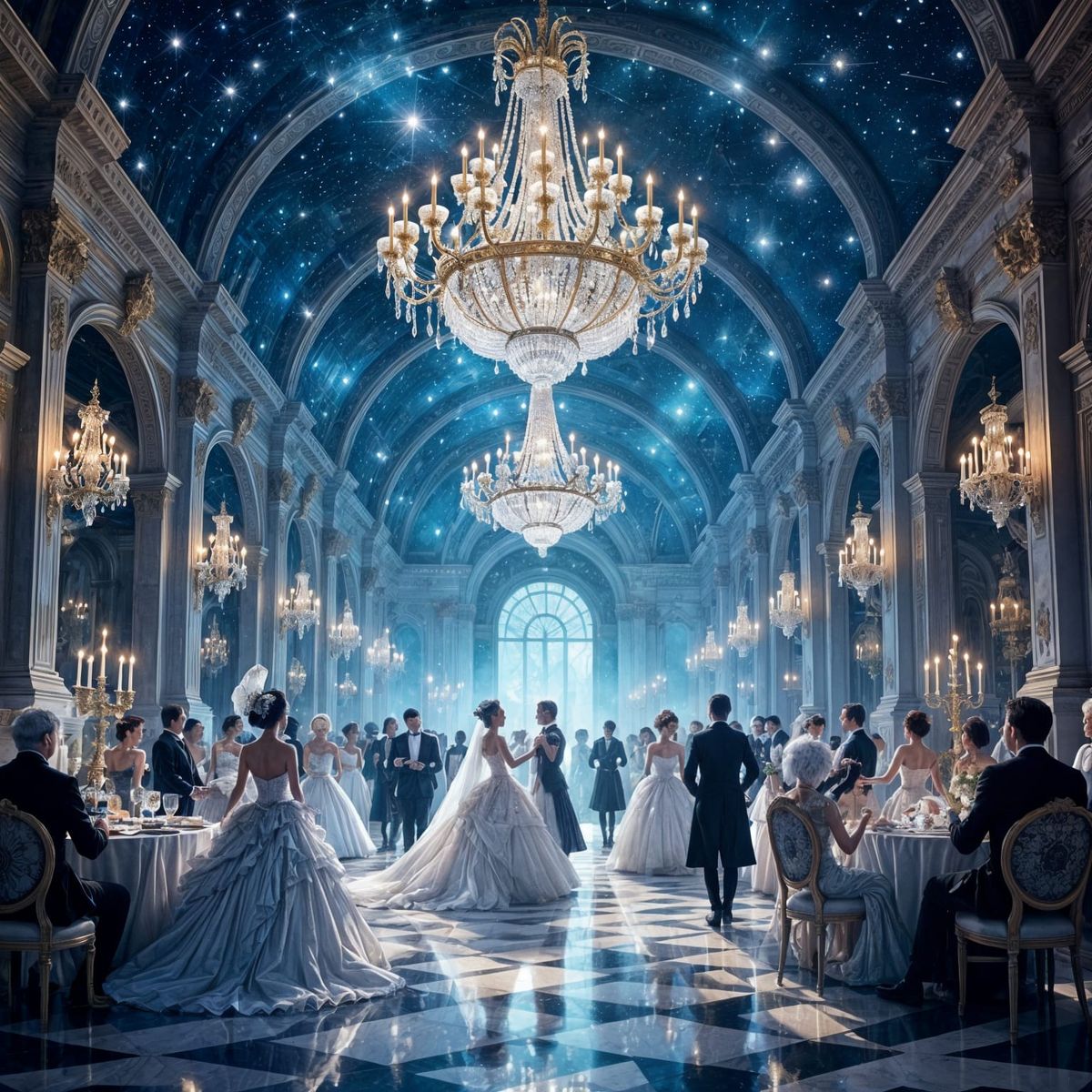 A dreamlike digital painting of animals in historical dress waltzing in a star-filled ballroom. Features rococo and futuristic architecture with dramatic lighting.