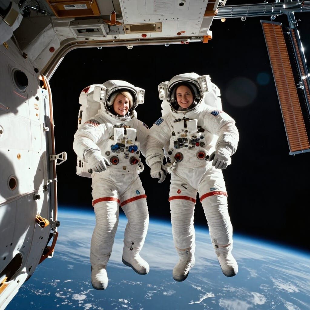 This image shows two female astronauts in detailed A7L spacesuits exiting the ISS airlock. Lit by Earth's glow and stars, it features cinematic lighting and lens flares, evoking NASA's space exploration photography.