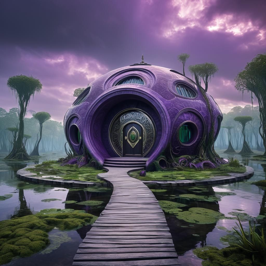 A striking picture of a surreal, alien home in a vibrant, otherworldly swamp. The home features curved architecture, smooth textures and a long stone walkway leading to a large, round door. Deep, rich colors and shades of purple add depth.