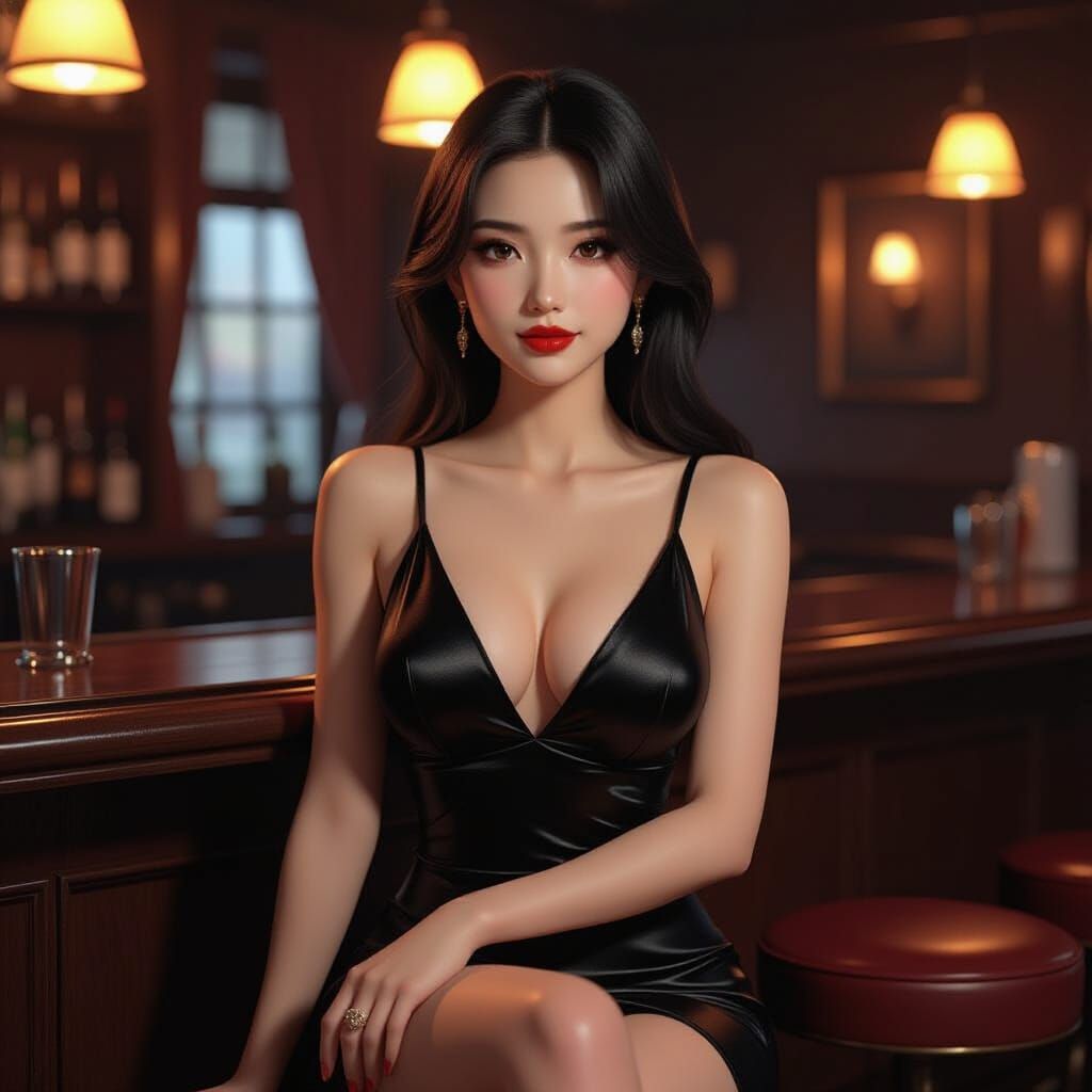 A captivating image of an East Asian woman at a vintage bar. The image is rendered in a semi-realistic 2.5D anime style with moody lighting, reminiscent of high-end fashion photography.