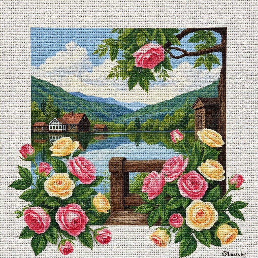 This idyllic scene depicts a serene cottage garden adorned with lush climbing roses, as if rendered in intricate needlepoint. A soothing retreat from the world, reminiscent of a bygone era's gentle charm.