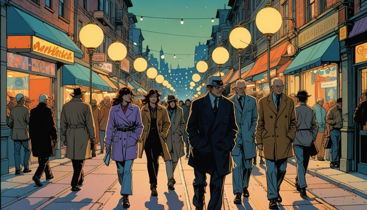 This image shows people on a vibrant street at night with colorful string lights. The scene is rendered in a comic book style, with soft glowing street lamps and a pastel color palette.