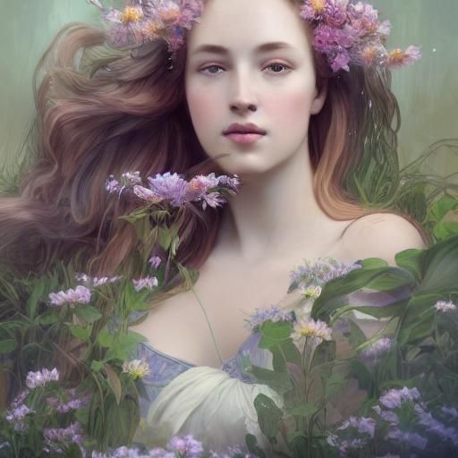 A portrait of a beautiful woman with long flowing hair in a flower field. The artwork exhibits dynamic lighting and intricate details reminiscent of Renaissance paintings.