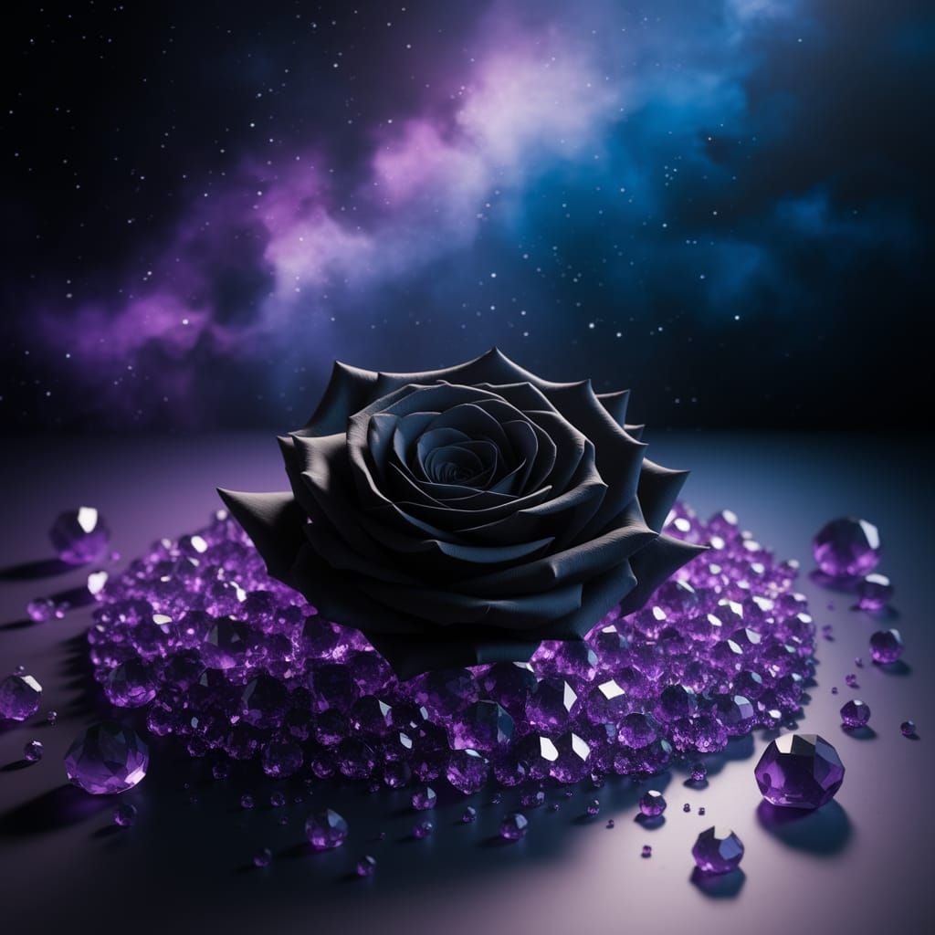 A striking picture of a single black rose on a bed of amethyst crystals. The background is a swirling nebula of purples and blues, dotted with distant stars, embodying mystery and otherworldly beauty.