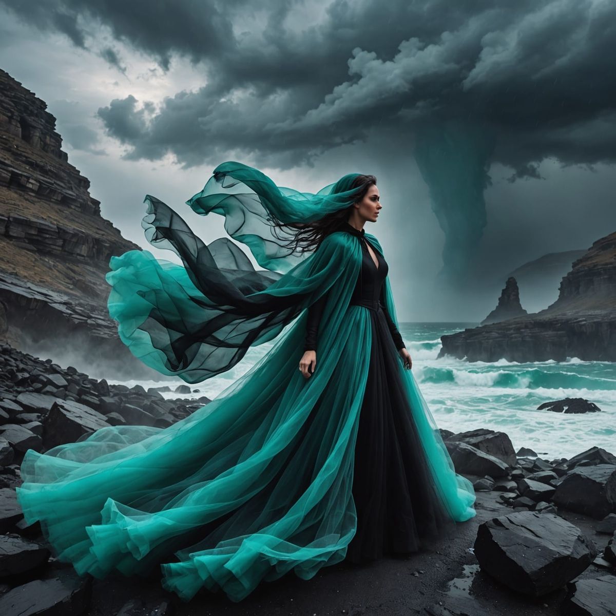 This image depicts a mysterious lady standing on high rocks above a dark abyss, created with translucent turquoise and black tulle. The scene is illuminated by a full moon at night, in a surreal aesthetic.