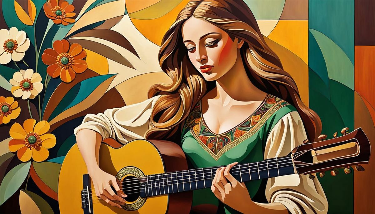 This image shows a beautiful young woman with green eyes playing a guitar in a serene and contemplative mood, surrounded by intricate patterns and ornate decorative elements, set against a warm golden hour background with rich wood grain and delicate flower patterns.