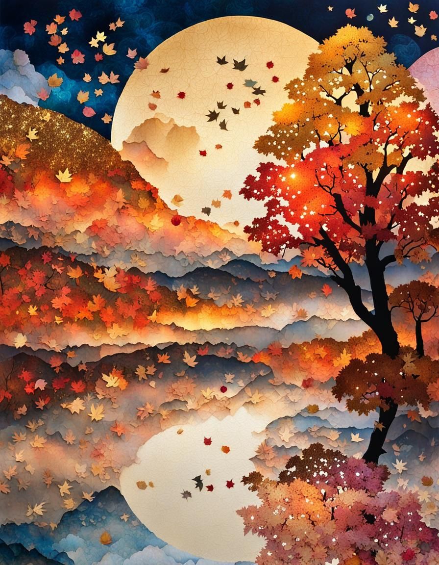 A striking collage of autumn at twilight. The image features intricate layers of translucent paper, pressed petals, glitter, and sequins, creating dimension and rich textures in an expertly lit composition.