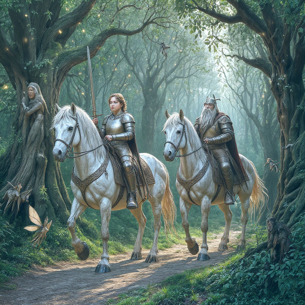 This image shows two armored riders on white horses in an enchanted forest filled with fairies. One rider is a boy with a claymore, the other a dwarf. A tar-covered fairy spies on them.
