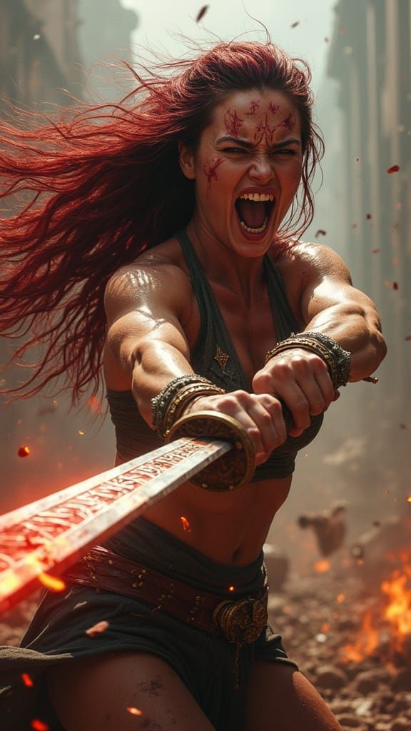 This image shows a warrior goddess in the throes of battle, her face a mask of fury. The hyperrealistic portrait captures her superhuman strength and the raw intensity of combat.