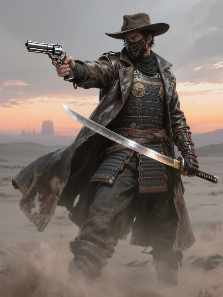 This image shows a lone hero in samurai armor and duster, posed heroically in a dusty landscape. The artwork blends elements of manga and fantasy illustration.