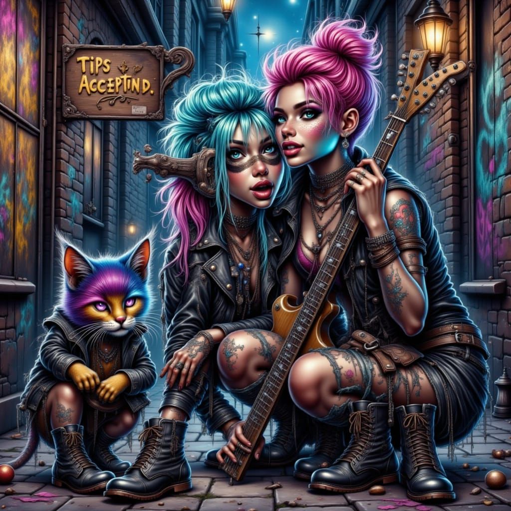 Design your own punk rock scenes easily! Generate unique images of musicians and their companions for free.