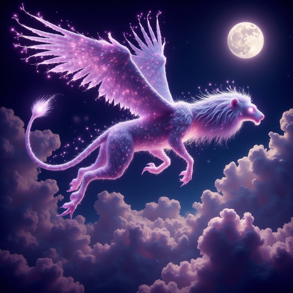 This image shows a regal gryphon in flight, surrounded by a radiant full moon, purple lights, and dynamic energy, evoking a fantastical atmosphere reminiscent of classic fantasy art with intricate details and dreamlike surrealism.
