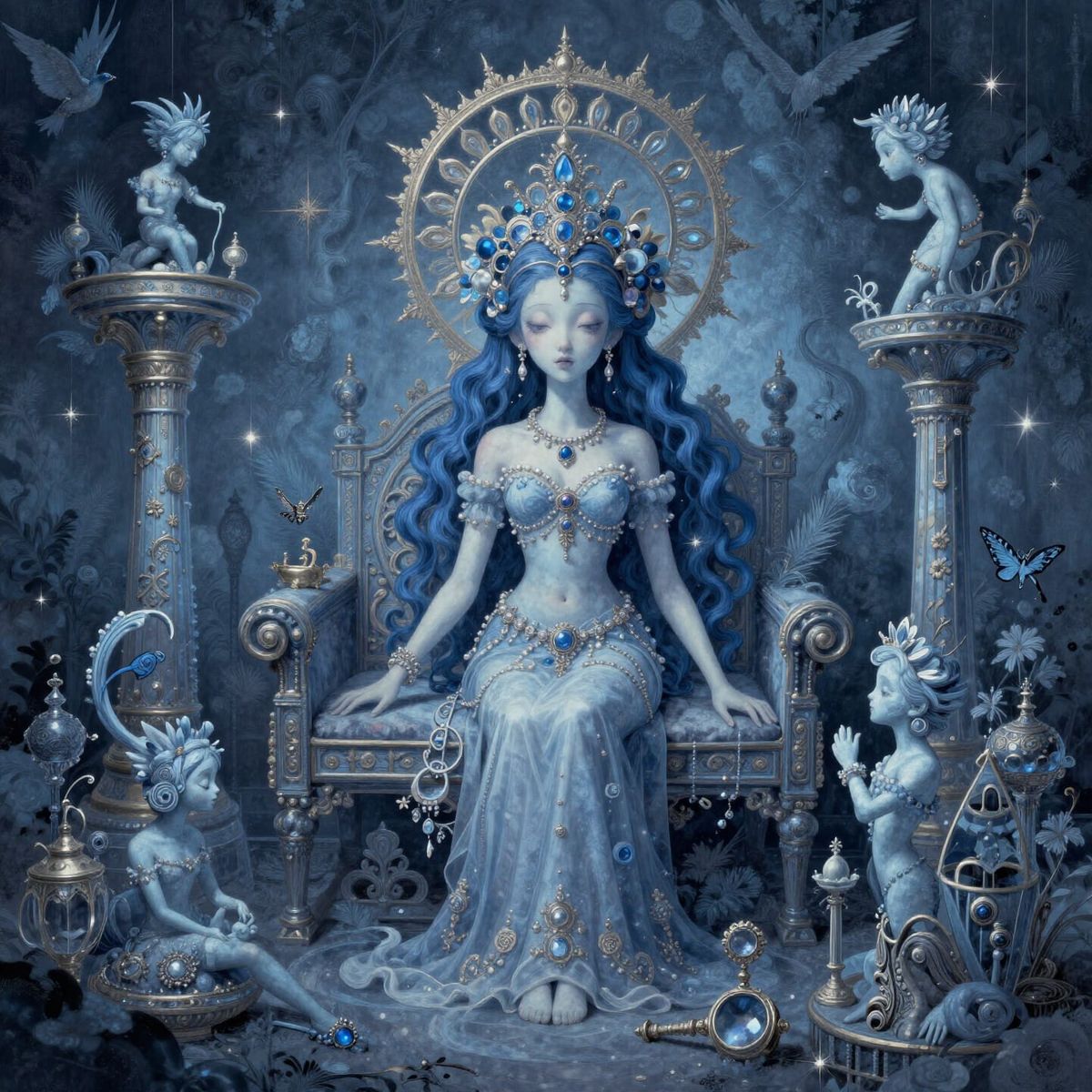 This image shows a gorgeous, surrealistic illustration of a blue temple, rendered in a unique artistic style.