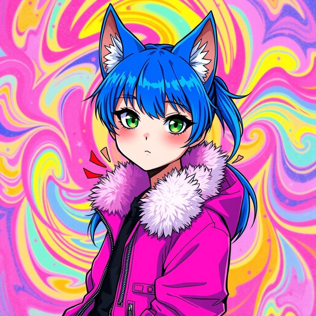 A striking anime neko girl with electric blue hair and piercing emerald eyes, set against a kaleidoscopic background of bright colors, blending bold lines and textures with soft pastel hues and dynamic composition.