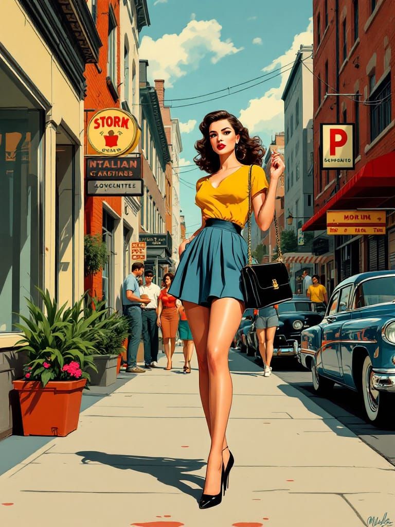 This image features a 1950s pin-up woman in a pleated skirt and high heels, standing confidently on a busy city sidewalk. The artwork uses bold ink outlines, flat colors, and simplified geometric forms for a cheerful, nostalgic graphic look.