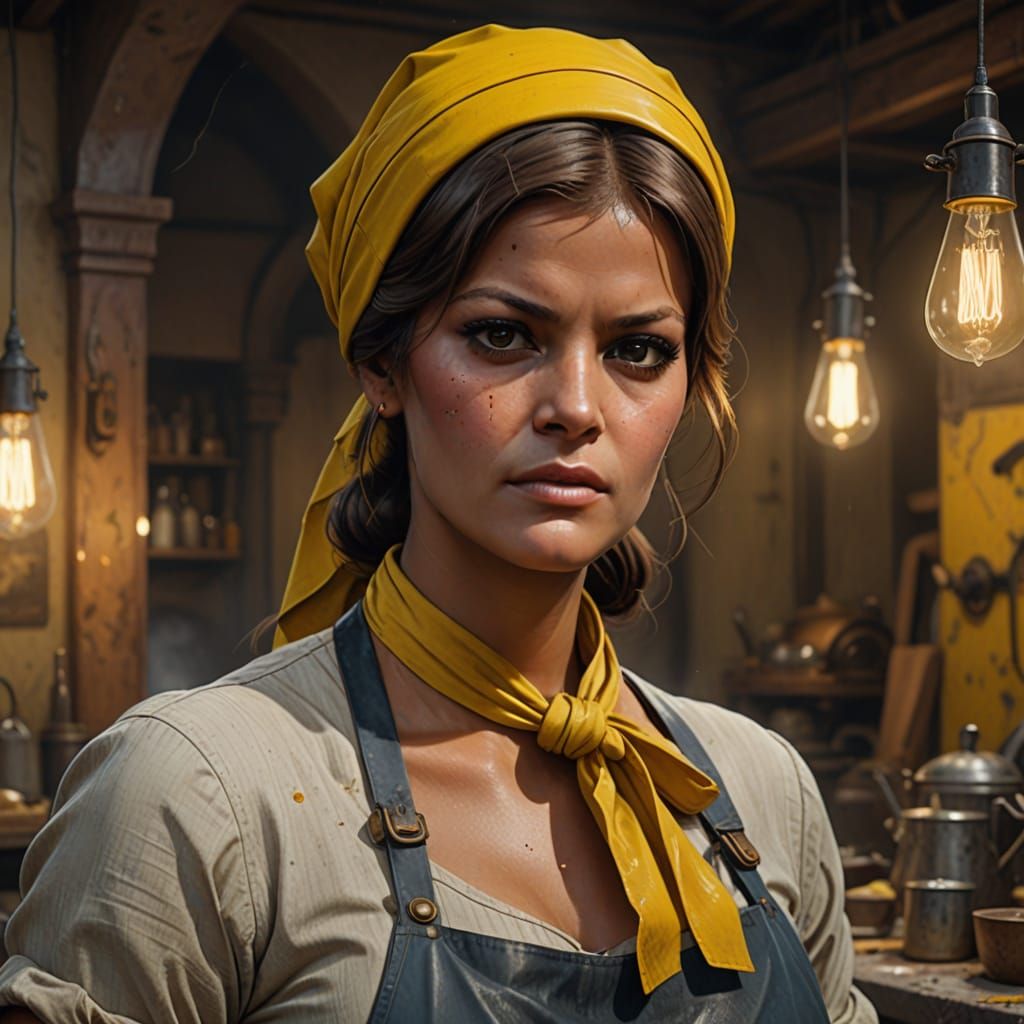 This image is a detailed portrait of a young woman, reminiscent of Italian cinema, wearing worn clothing and displaying a tired expression, rendered in triadic colors with intricate details and dynamic lighting.