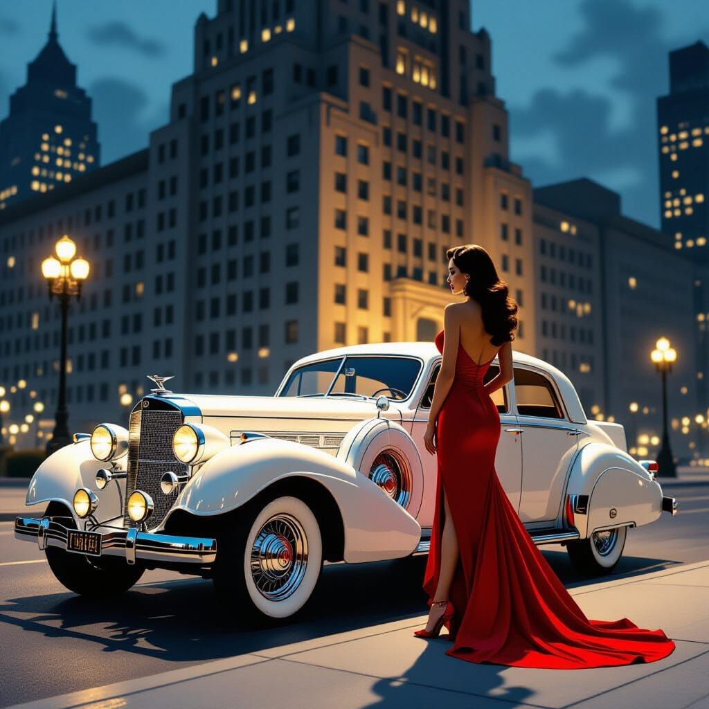 This image captures an elegant woman in a red gown beside a white 1930s Cadillac on a city street at dusk. Features a noir film aesthetic with dramatic shadows and highlights, evoking vintage cinema.