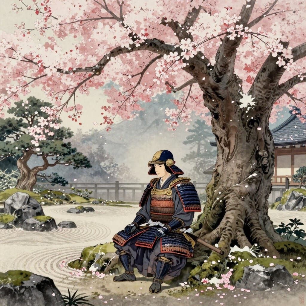 This image depicts an ancient warrior in detailed samurai armor meditating under a massive cherry blossom tree. Petals fall like snow in a serene Japanese garden, rendered in a ukiyo-e and fantasy art style.