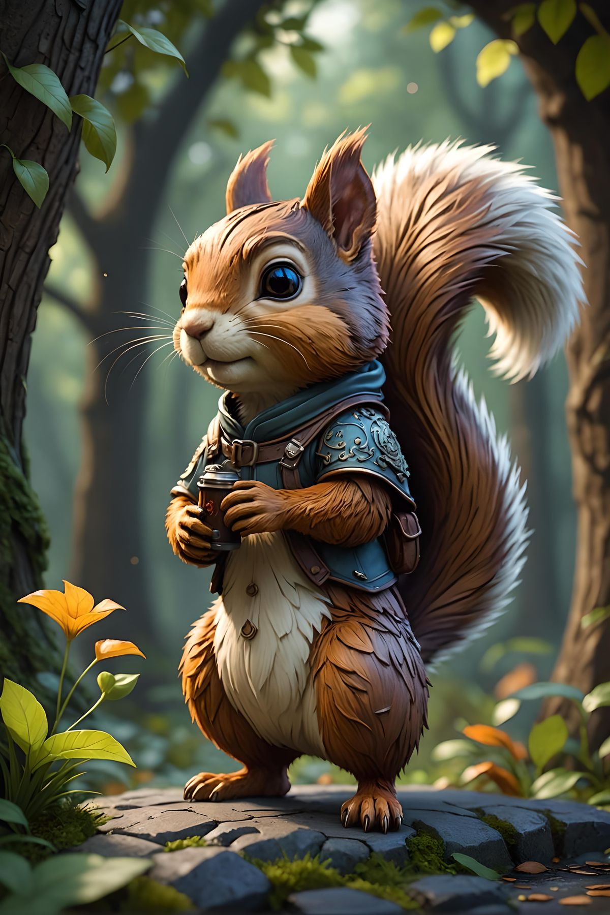 This image shows a cute, highly detailed chibi squirrel in 8k resolution. The concept art features dynamic and volumetric lighting with deep colors, reminiscent of Artstation trends.