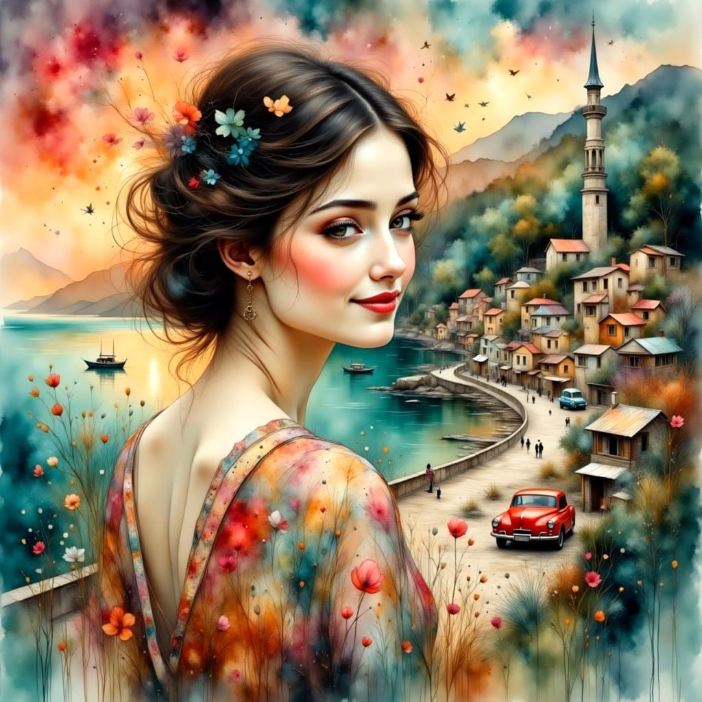 This image depicts a surreal landscape with elements of ancient towns and vintage cars, rendered in a dreamy watercolor style with a palette of cream, teal, and red.