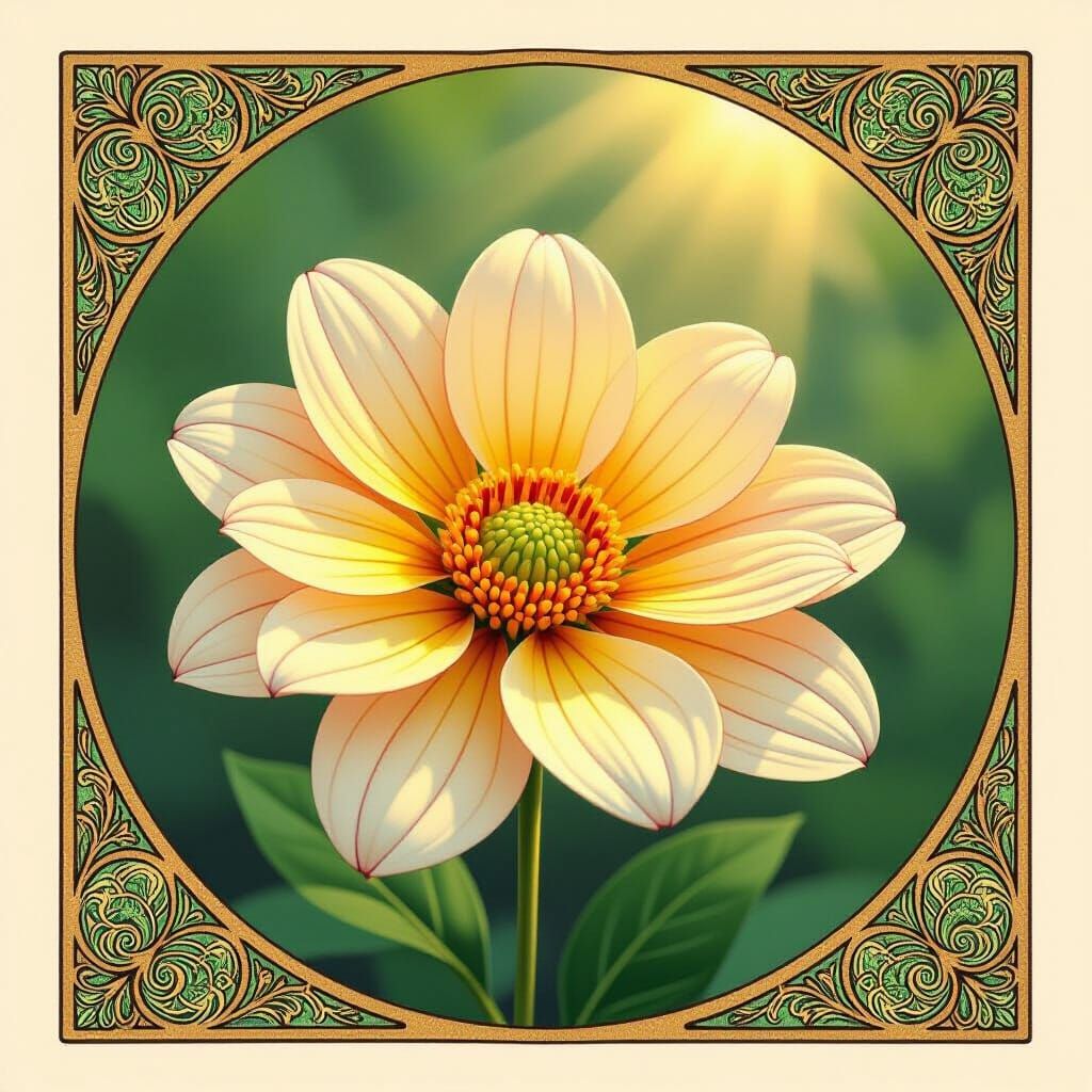 This Art Nouveau illustration features a preserved pressed flower resembling book pages, with sunlight illuminating its vibrant, jewel-toned petals. It evokes timeless beauty and romantic nostalgia.