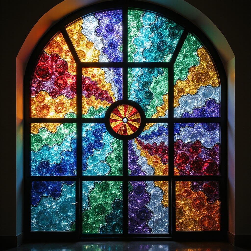 This vibrant stained glass window features intricate fractals in emerald, sapphire, and amethyst hues, illuminated by brilliant light and showcasing kaleidoscopic patterns and radiant textures reminiscent of abstract expressionism.