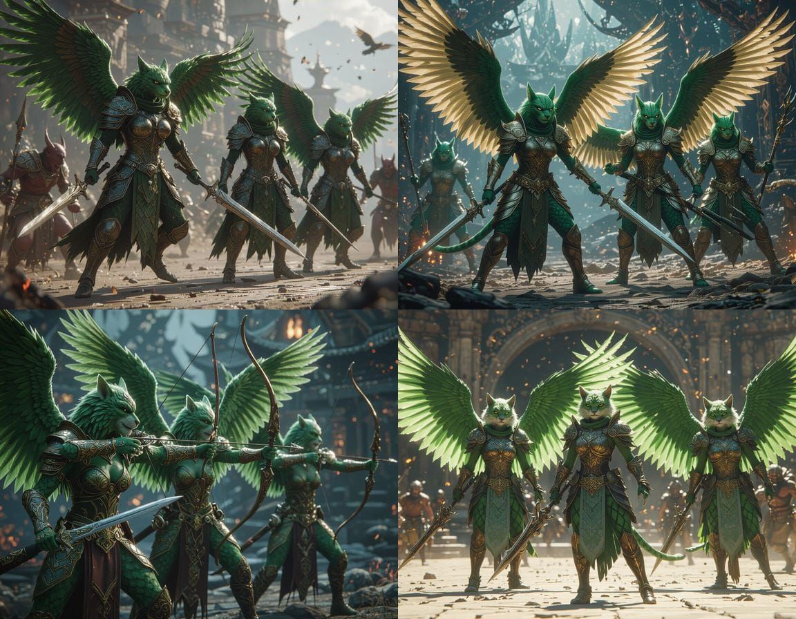 This image shows four winged, green weretigresses in armor battling demons. The scene has a cinematic, high-resolution, 3D rendered aesthetic with dynamic lighting and intricate details.