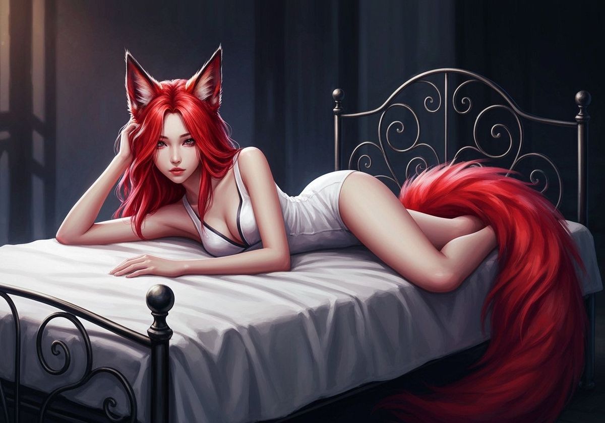 This image shows a beautiful young Asian fox-woman with red hair reclining on a wrought-iron bed. The artwork features expressive brushstrokes and hyper-realistic details in a digital painting style.