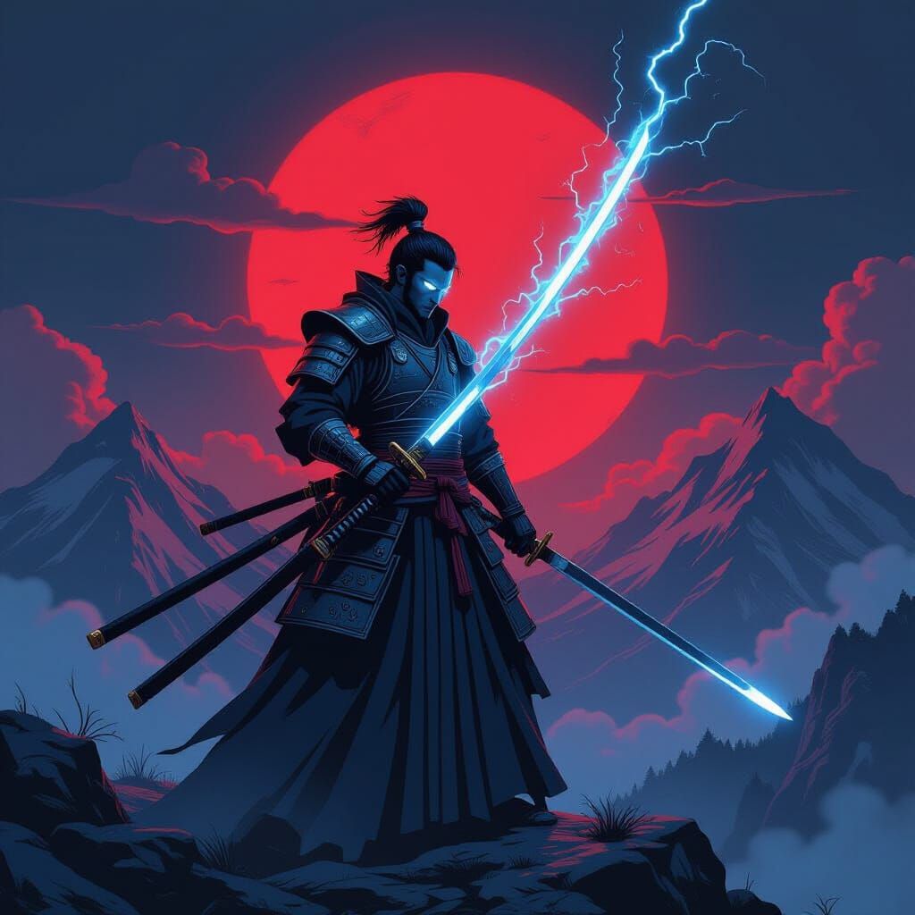 A samurai warrior stands on a mountain at night, holding a flaming sword. The image evokes a dark fantasy aesthetic, with bold lines and mystical energy.