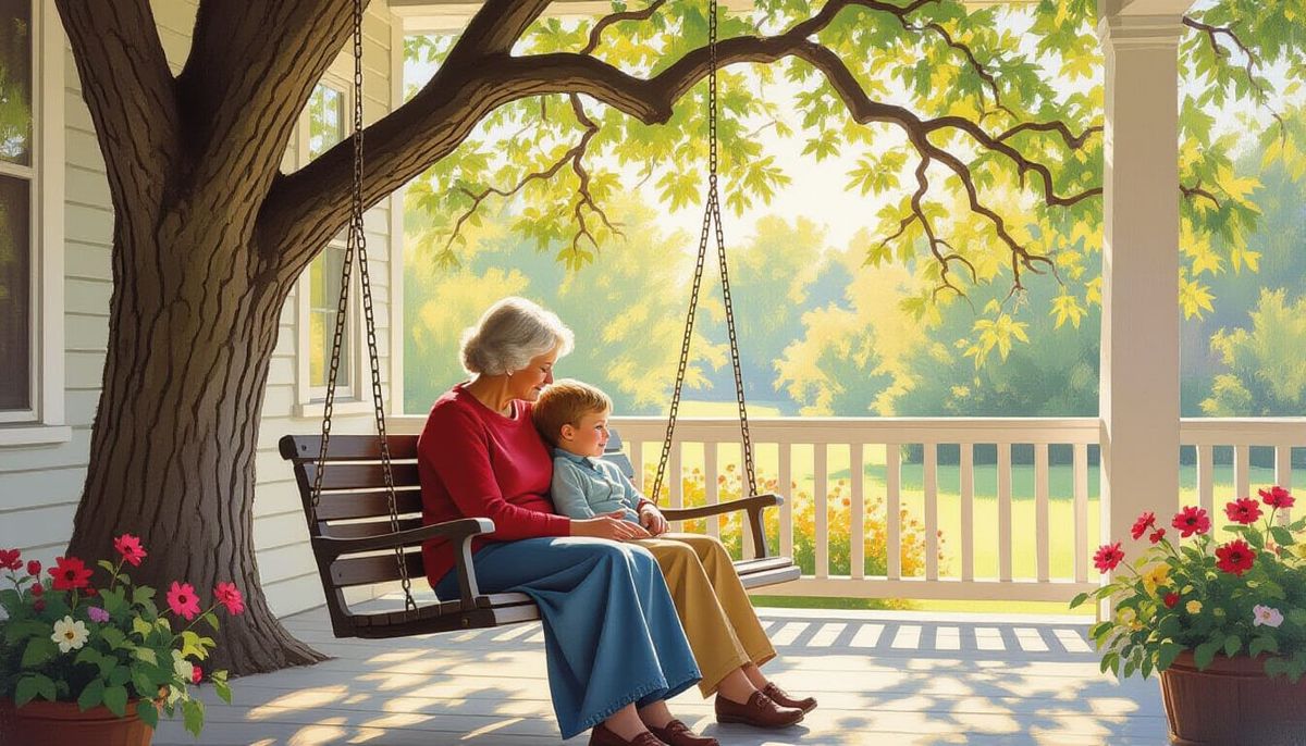 This image shows a peaceful scene of a grandmother and grandson on a sunlit porch swing. Rendered in a soft, impressionistic style, it evokes warmth and nostalgia through gentle light and color blending.