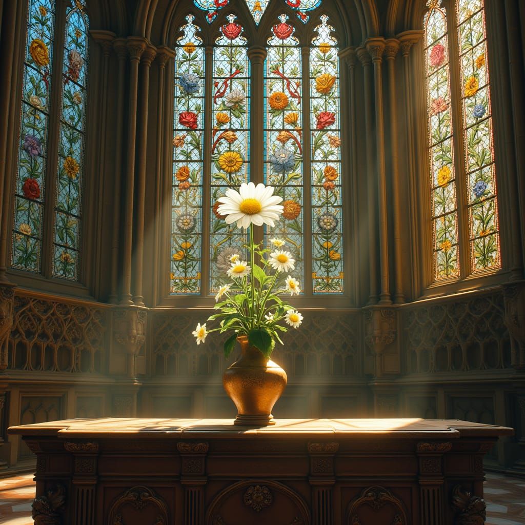 This image shows a stunning Victorian Gothic cathedral with intricate stone carvings, soaring ceilings, and breathtaking stained glass windows depicting vibrant flowers, including roses, lilies, and sunflowers. At the heart of the cathedral, a beautiful altar stands, adorned with foliage and vines, holdi...
