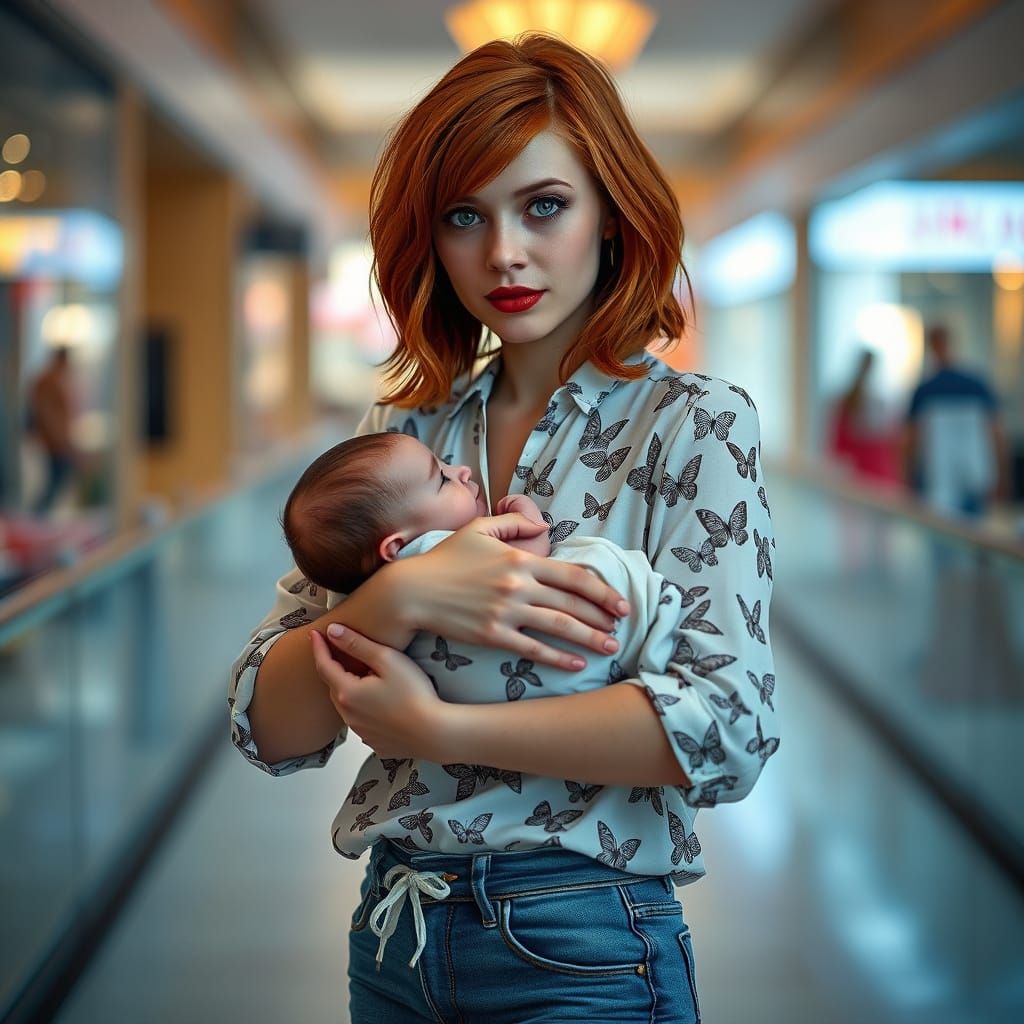 A cinematic portrait of a young mother holding her baby. The image, reminiscent of a film still, features warm colors, subtle film grain, and a vignette effect, evoking a realistic and intimate atmosphere.