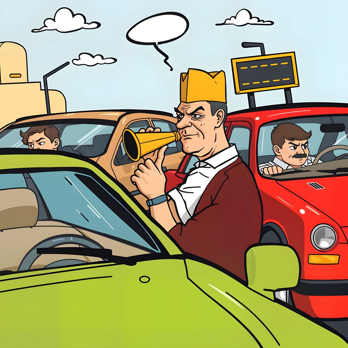 This image depicts a humorous and surreal scene of a man stuck in traffic, honking his horn, at the exact moment patience was being distributed.