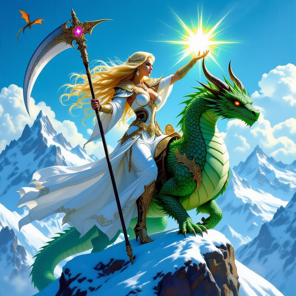 A female warrior with long blonde hair, wearing an ornate white dress with many gold accents is riding a green and white dragon. She is holding a scythe in one hand and a gem in the other hand. The gem is radiating beams of light. She is standing high on a snowy mountain looking out over other mountains ...