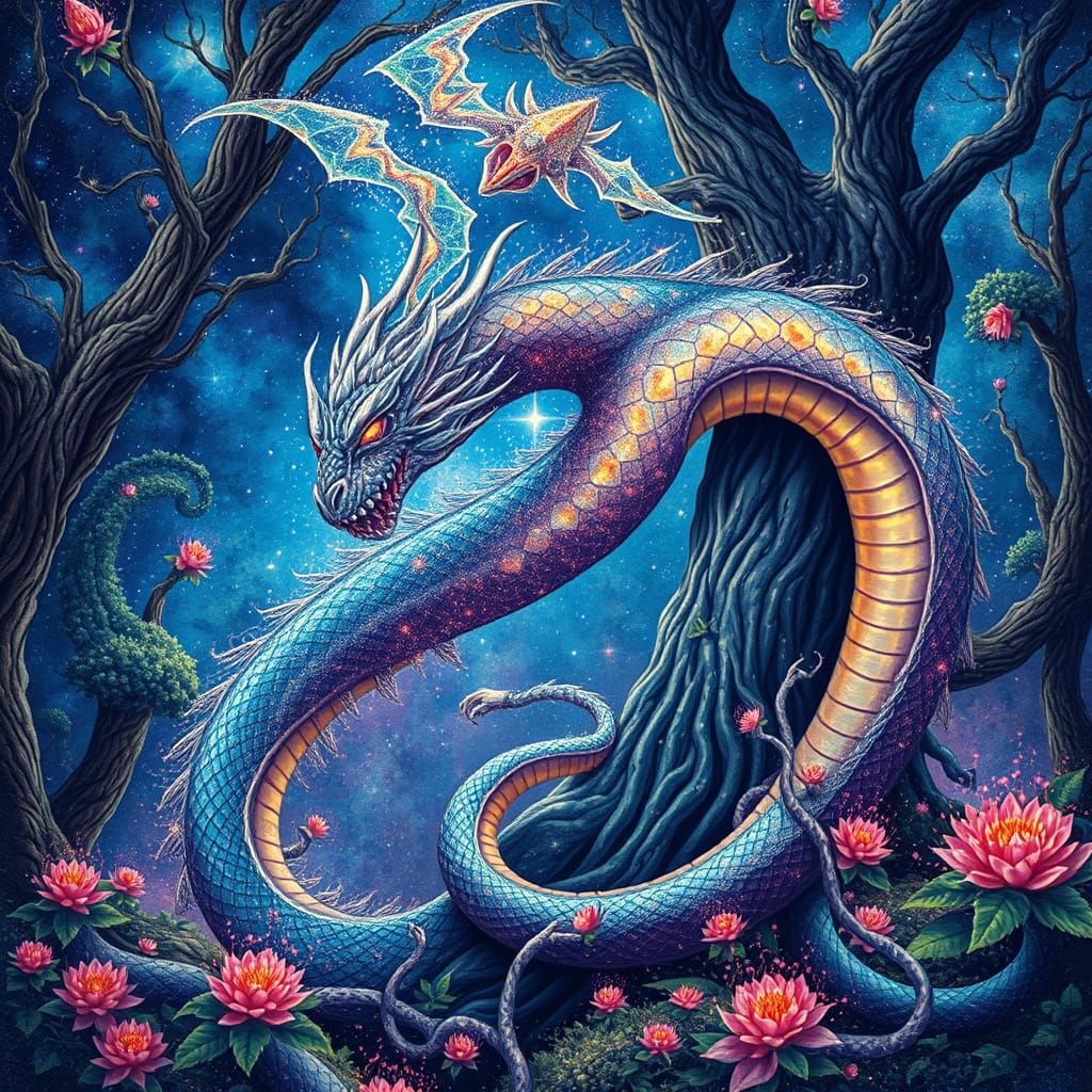 A cosmic dragon battles a multi-headed hydra amidst glowing flora. The image features intricate, swirling patterns reminiscent of holographic astral illustrations in a visionary art style.