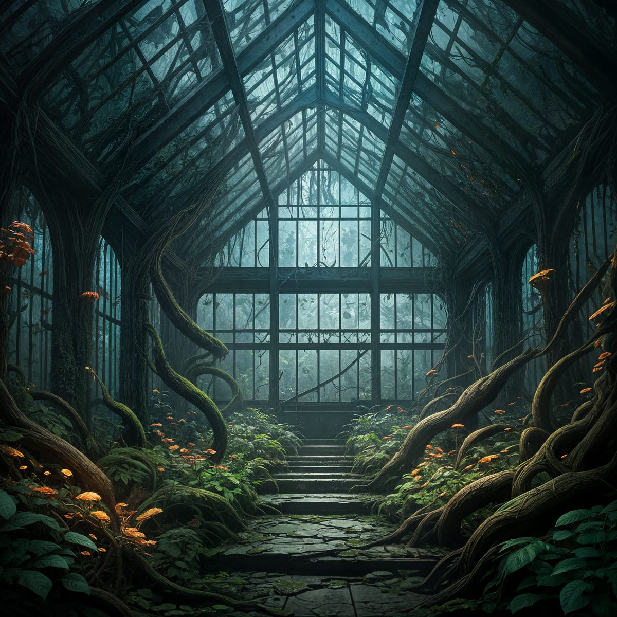 A captivating image of an abandoned greenhouse reclaimed by nature. Bioluminescent flora illuminates the dilapidated structure, creating a dark fantasy scene with volumetric lighting.
