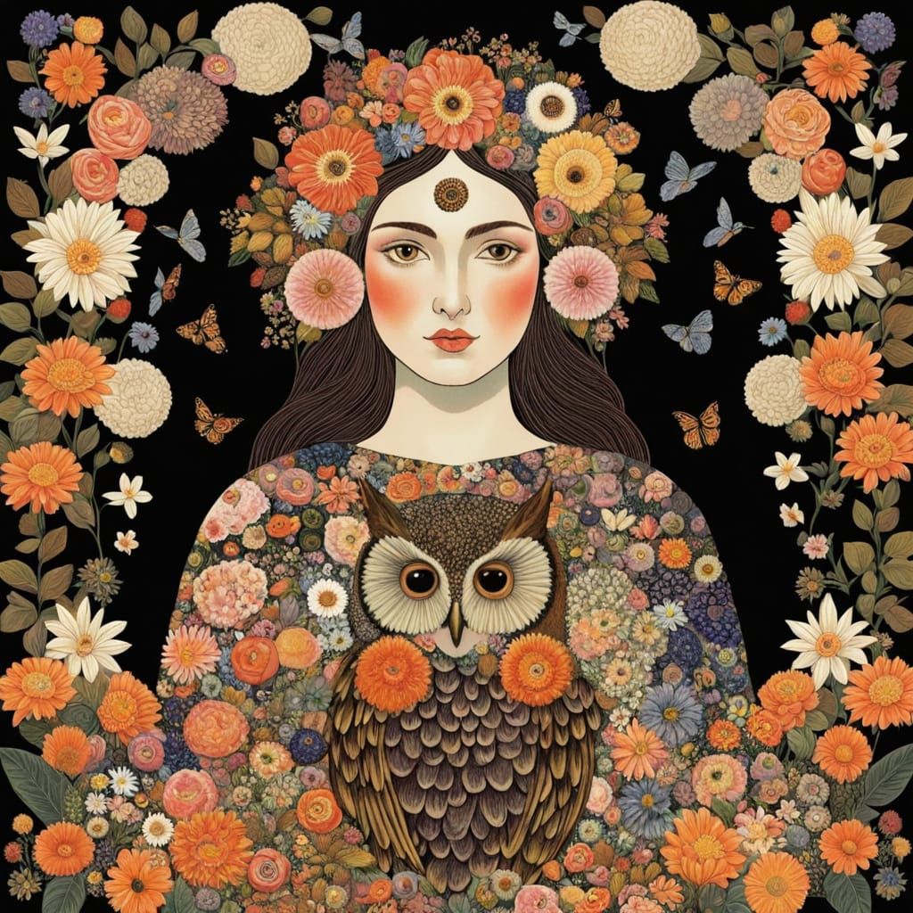 This image shows a beautiful blend of floral and avian elements, evoking the styles of Gustave Klimt and Ernst Haeckel, in a vibrant and intricate depiction of the flower goddess's face and the owl goddess's voice, symbolizing the turning of the year and the power of nature.