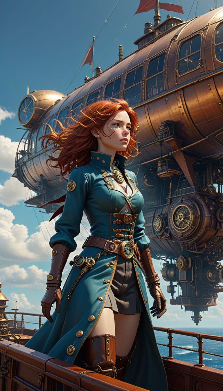 This image shows a red-haired woman standing on a large, elaborate airship. The steampunk aesthetic features gleaming brass and copper, with complex mechanisms against a swirling sky. The scene is rendered as a hyperdetailed digital illustration.