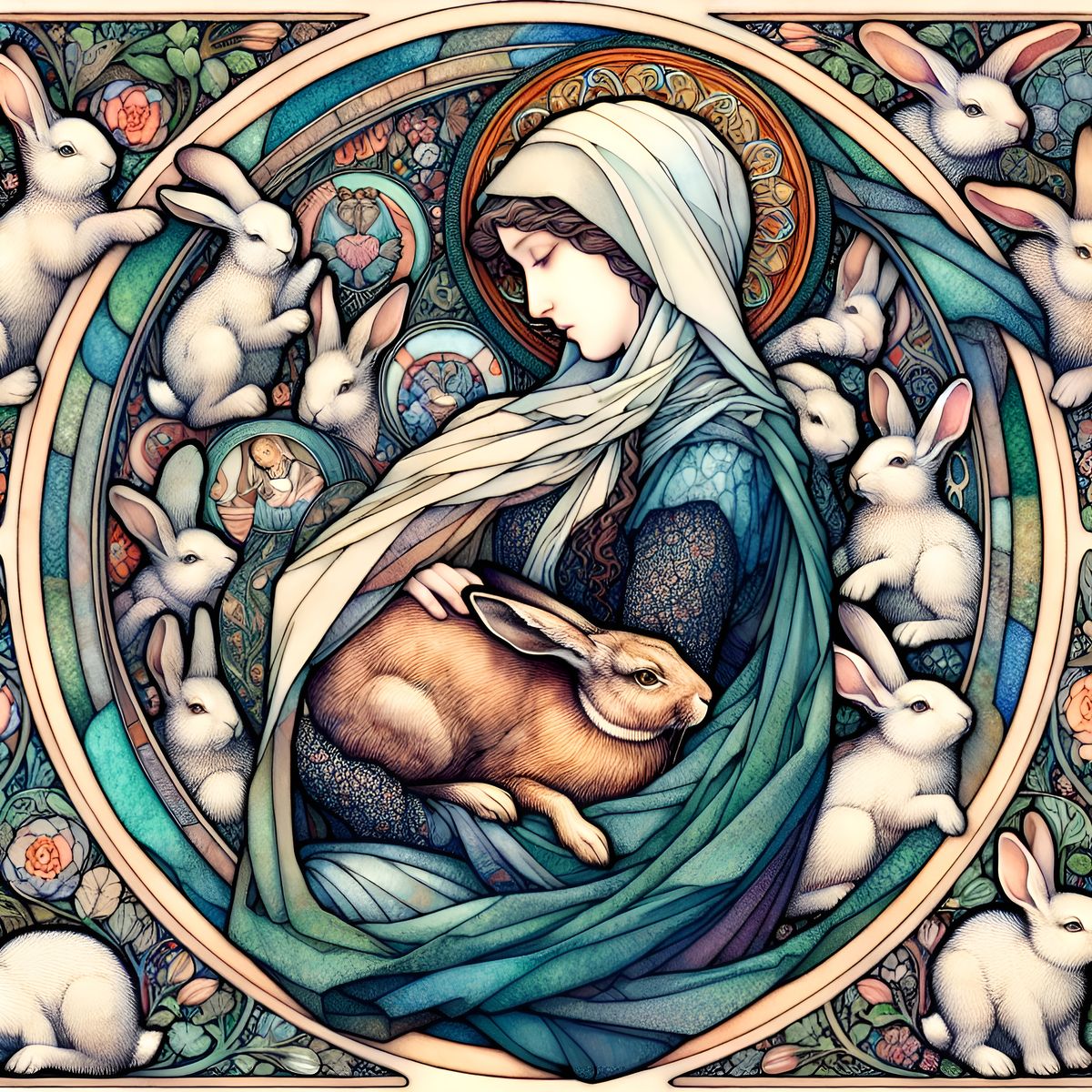 A beautiful Irish woman from the Middle Ages is surrounded by adorable hares and rabbits in a vibrant, ethereal scene reminiscent of Art Nouveau and Symbolism art, created in a whimsical watercolor style.