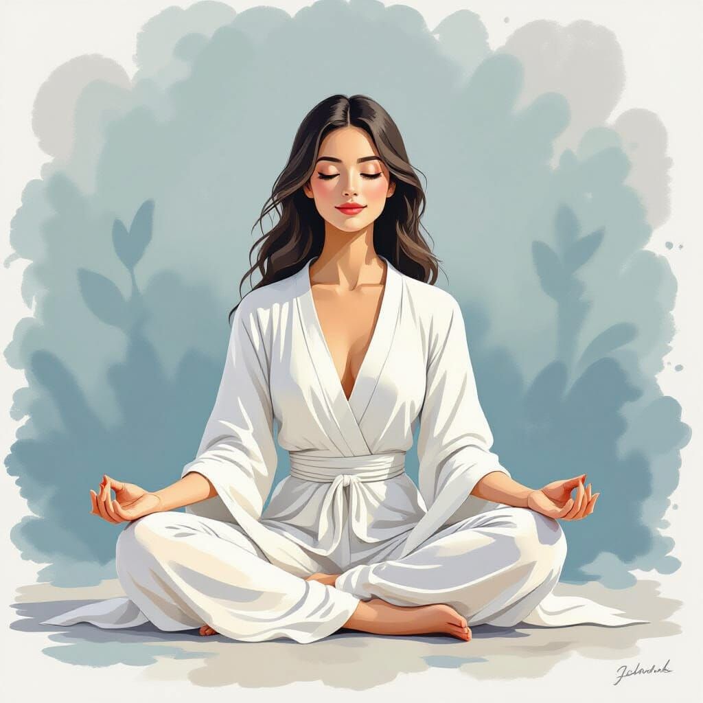 This image shows a serene woman meditating in lotus pose. Soft brushstrokes and gentle colors create a tranquil, ethereal atmosphere, reminiscent of classic watercolor illustrations.