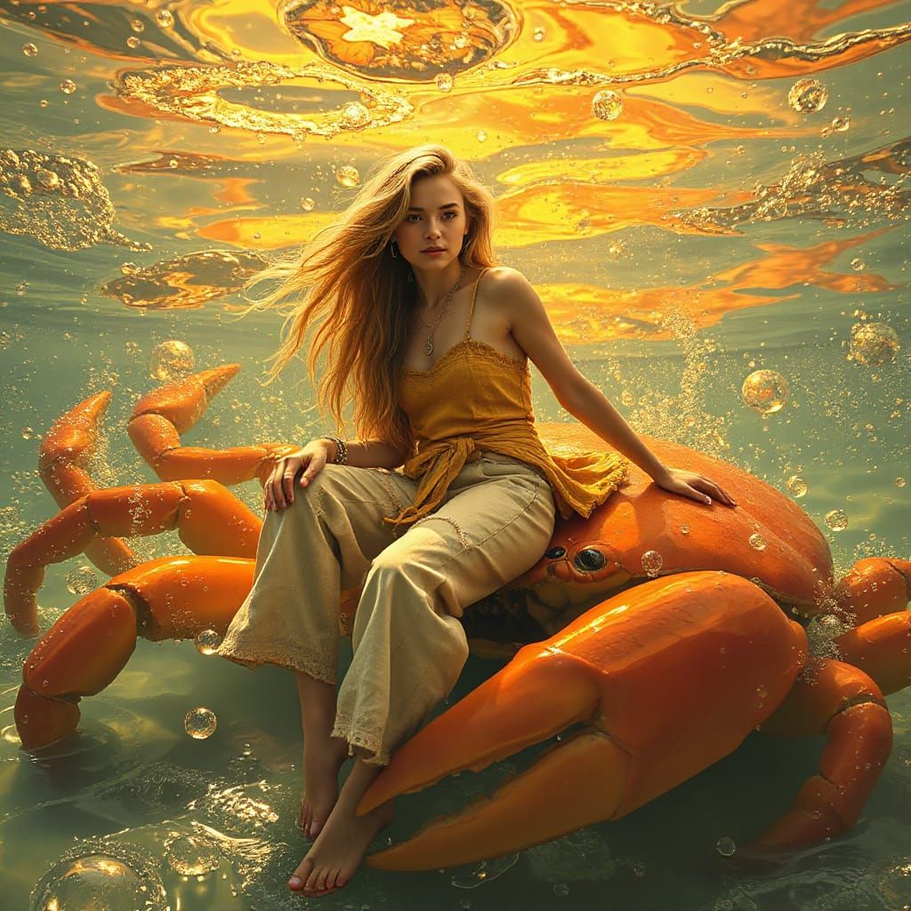 A surreal image of a woman with golden hair in bohemian attire, riding a giant gummy crab in a bubbly, dreamlike soda ocean with warm hues. Features ethereal lighting and intricate textures.