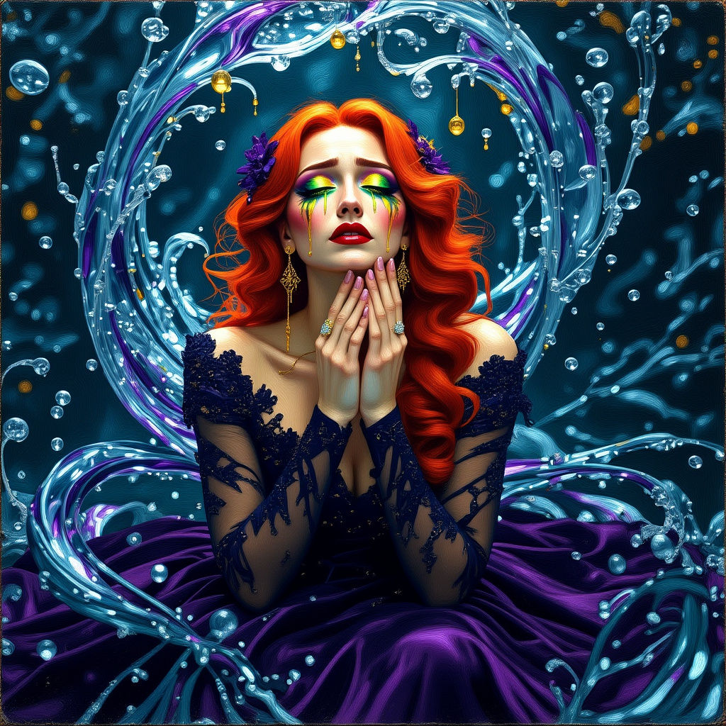 This image showcases a glass statue of a red-haired woman in a dark purple dress, weeping gold and green tears amidst swirling silver and purple ink, presented in a dynamic, hyperdetailed dark fantasy style with rich, contrasting colors.