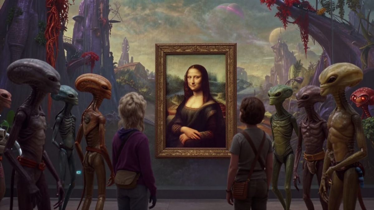 This photorealistic image depicts diverse aliens viewing the Mona Lisa in an off-world museum. The scene features an exotic cityscape and a crepuscular sky with nebulae.