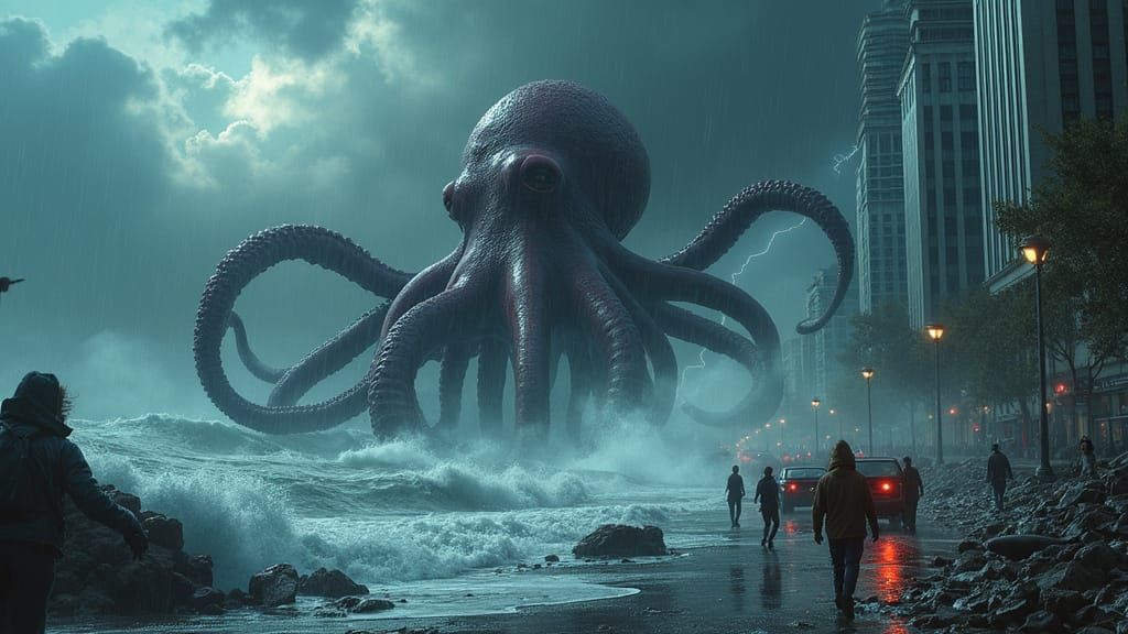 This image shows a giant octopus attacking a coastal city during a tsunami. The scene depicts survivors fleeing amidst destruction, rendered in a hyperrealistic, cinematic style with dramatic lighting and intense atmosphere.
