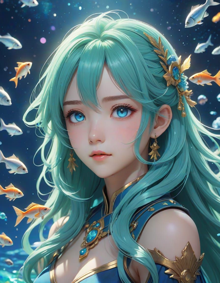 This serene 3D anime portrait features a maiden with flowing, galaxy-colored hair and sparkling ocean blue eyes, surrounded by fish in a vibrant, starry galaxy background. Delicate textures and dreamy water elements create a soft, ethereal atmosphere.
