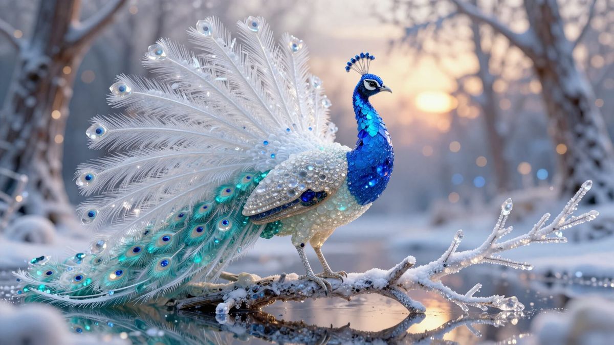 This hyperrealistic macro image showcases an ultra-detailed peacock statue crafted from precious gemstones and crystals, perched on a snow-covered branch in a magical forest at sunset.