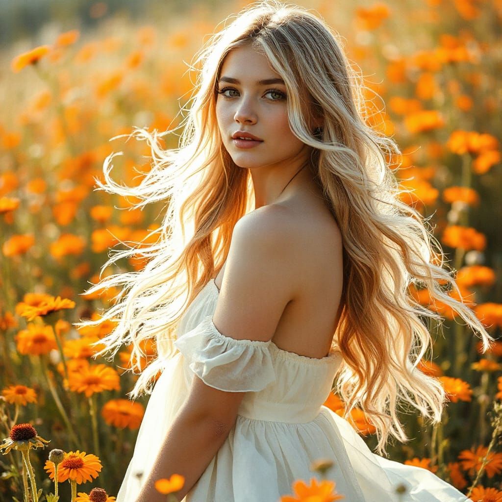 A double exposure portrait of a young woman with long blonde hair in a wildflower meadow. This image, reminiscent of watercolor art, is bathed in ethereal light and rendered with cinematic detail.