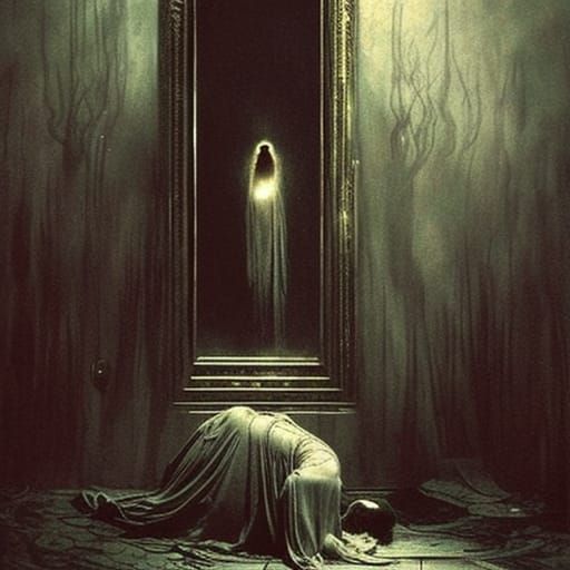 This image depicts a terrifying scene where a reflection is missing, rendered in a dark and gothic style reminiscent of classic horror illustrations.